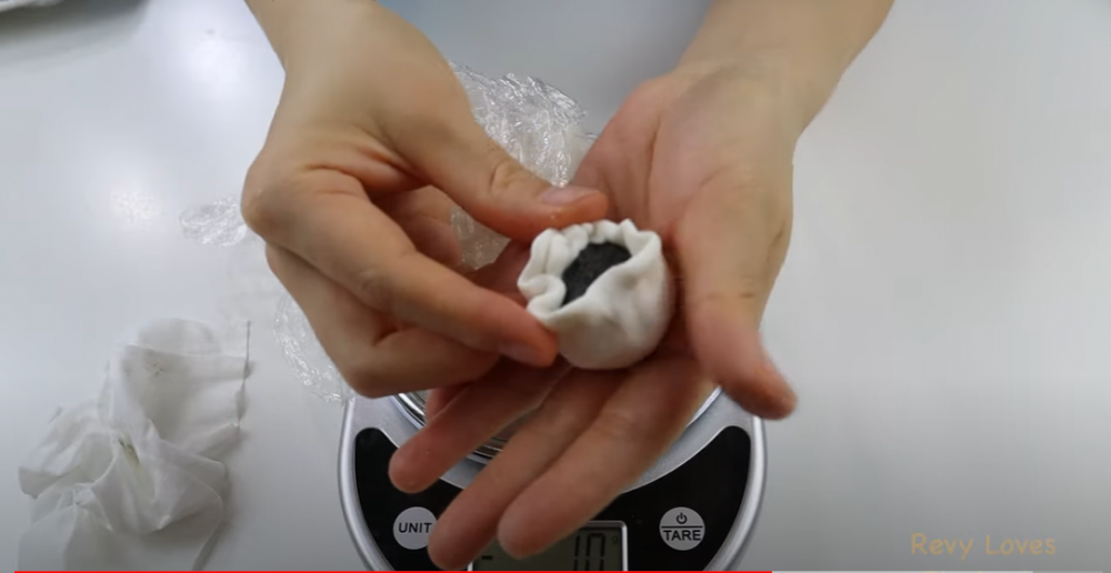 4)半小时后开始包,把糯米团放在厨房秤上,称归零,取一个15个的糯米团,然后揉成圆形,用手掌压一个小坑,边缘捏薄