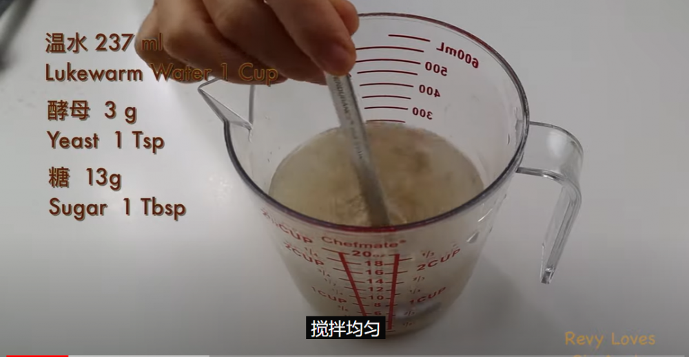 1)先把酵母,糖和温水混合, 把酵母激活
