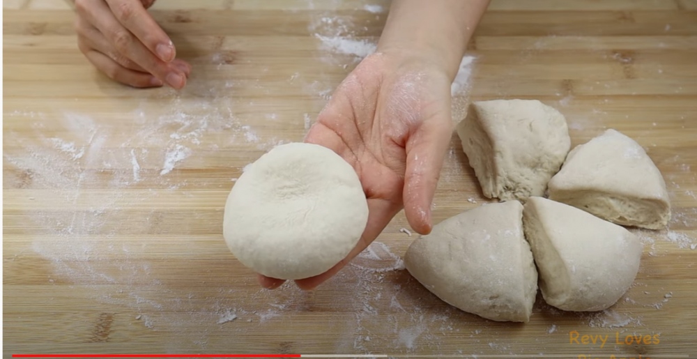 4)揉好后,分成6等份。每一份揉成一个圆形的面包坯,压扁。