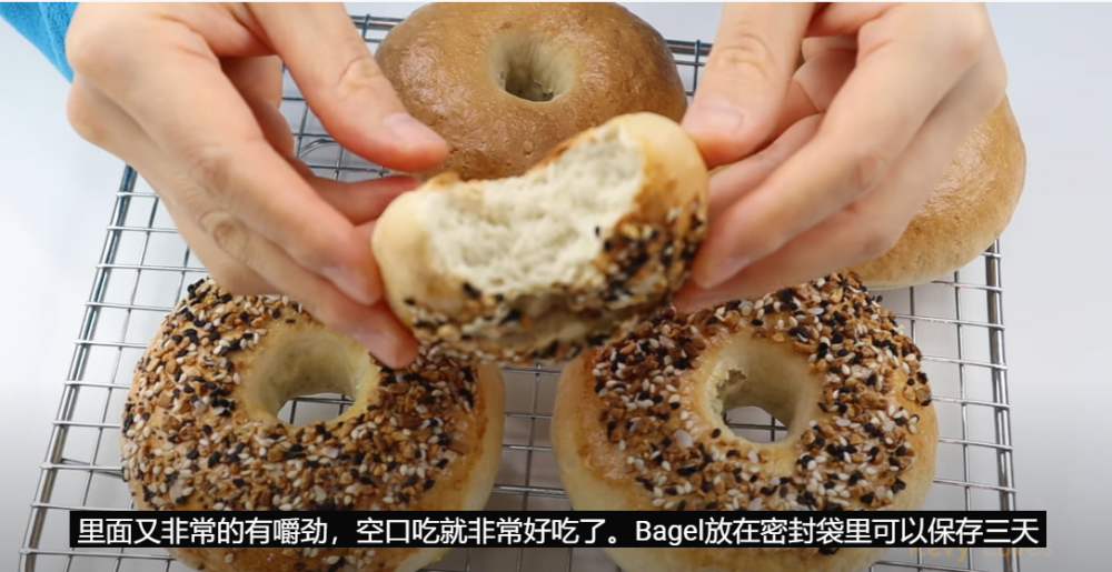 刚做好的贝果表皮是脆的,直接吃就非常好吃了。 没吃完的贝果放在密封袋常温可以保存三天。