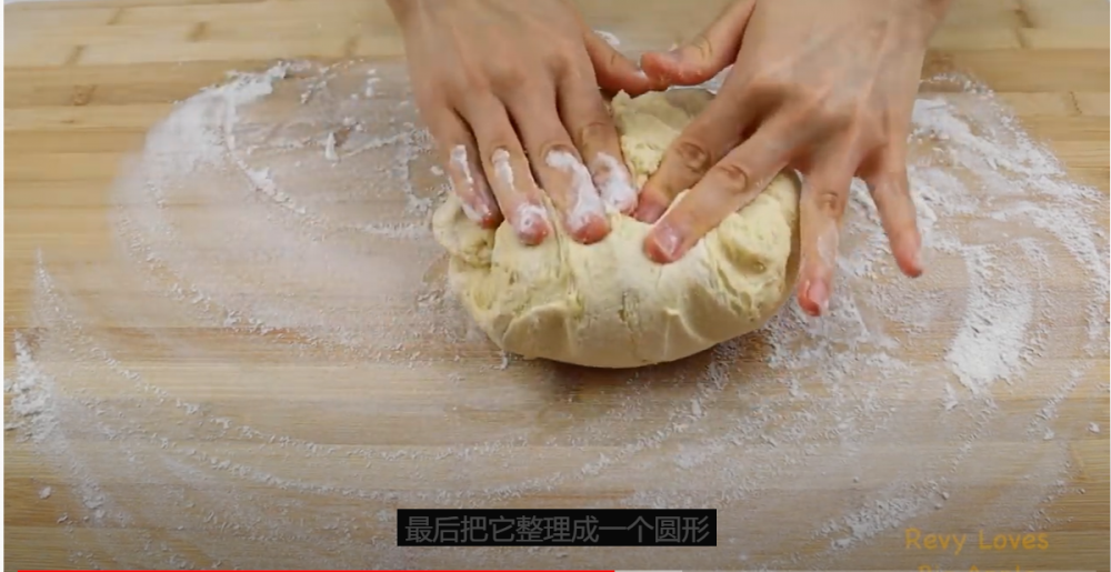 4)发酵好的面团倒在案板上,从四周向中间折叠几下,整理成圆形。