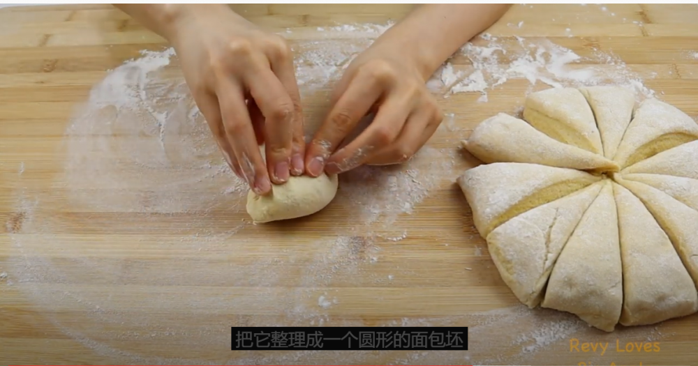 5)切成12等份,每一份继续从四周向中间折叠,整理成圆形的面包坯,之后放入烤盘,二次发酵到2倍大。