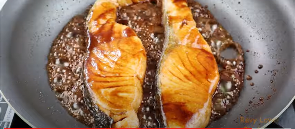 3)把料汁倒入锅中,熬至浓稠,之后放入煎好的三文鱼,用勺子淋一些酱汁在三文鱼的上面,这样两面都会很入味。