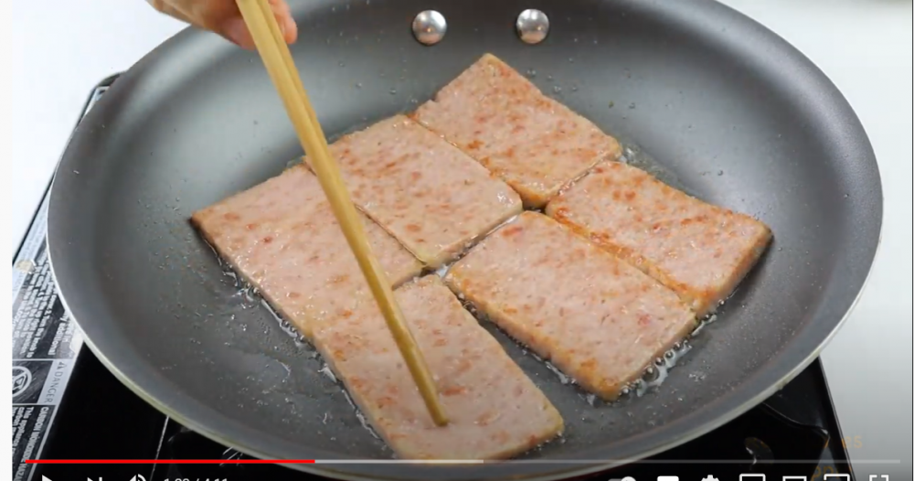 2)用煎午餐肉剩下的底油煎两个鸡蛋
