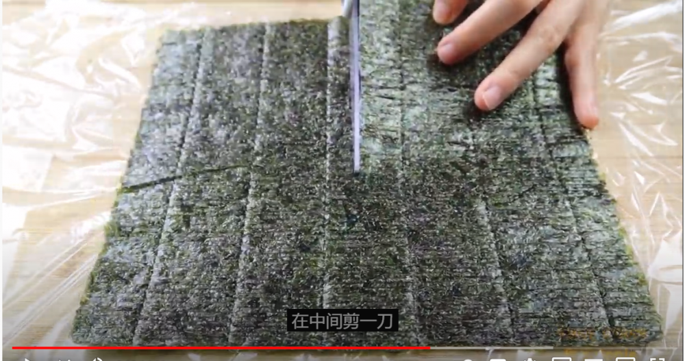 3)在案板上先铺上一层保鲜膜,在放上一层海苔(光面朝下),在中间剪一刀