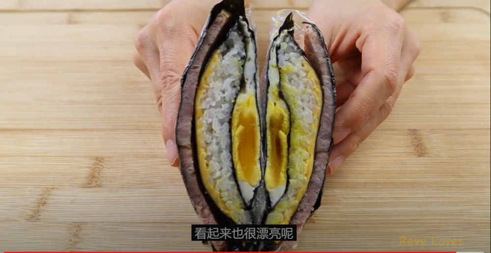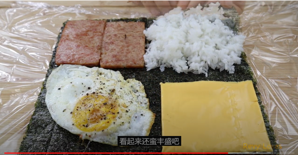 4)依次放上米饭,午餐肉,鸡蛋,和奶酪片,折叠起来即可