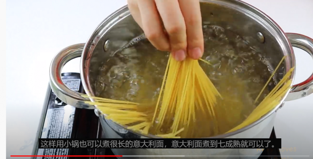 2)意大利面煮到7分熟,面放入水中的时候手先不要松开,向下压一压,这样用很小的锅也可以煮很长的面条。