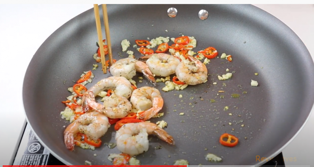3)平底锅倒油,先把蒜和小红椒煎香,之后放入虾仁,虾仁变色后盛出。
