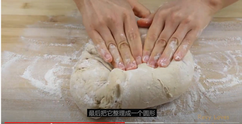 3)把面团倒在案板上,不用揉,从四周向中间折叠几下,整理成圆形。