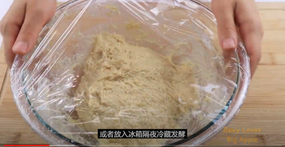 1)面团用免揉的方法,所有的材料混合好后放入冰箱隔夜冷藏发酵。