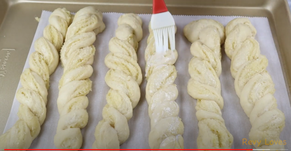 6)15分钟后,从第一个开始制作,把面包坯擀成长方形,涂上椰蓉馅,卷起来