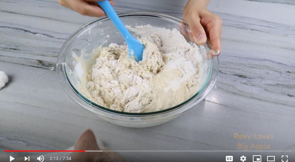 2)把混合好的湿料倒入干料中,搅拌成一个粘稠的面团,放入冰箱隔夜冷藏发酵