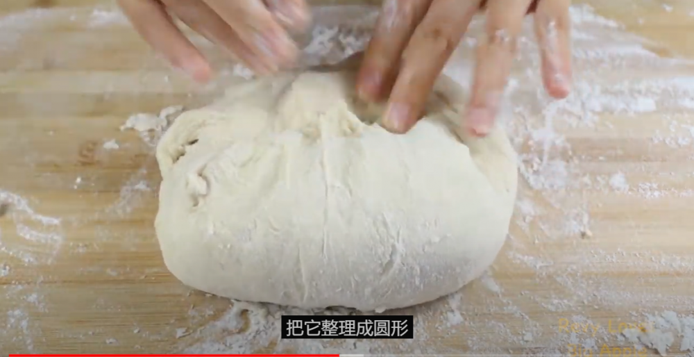 3)发酵好的面团倒在案板上,从四周向中间折叠几下,整理成一个圆形