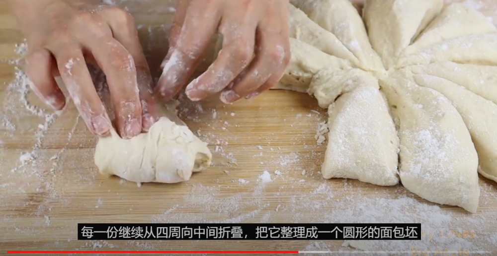 4)分成12等份,每一份继续从四周向中间折叠,整理成圆形的面包坯