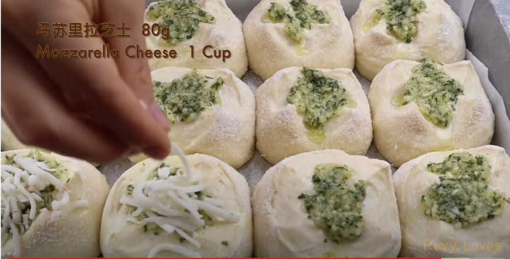 7)把蒜蓉馅涂在发酵好后的面包上,撒上马苏里拉奶酪,放入烤箱350度烤20分钟左右