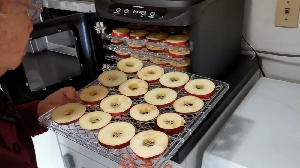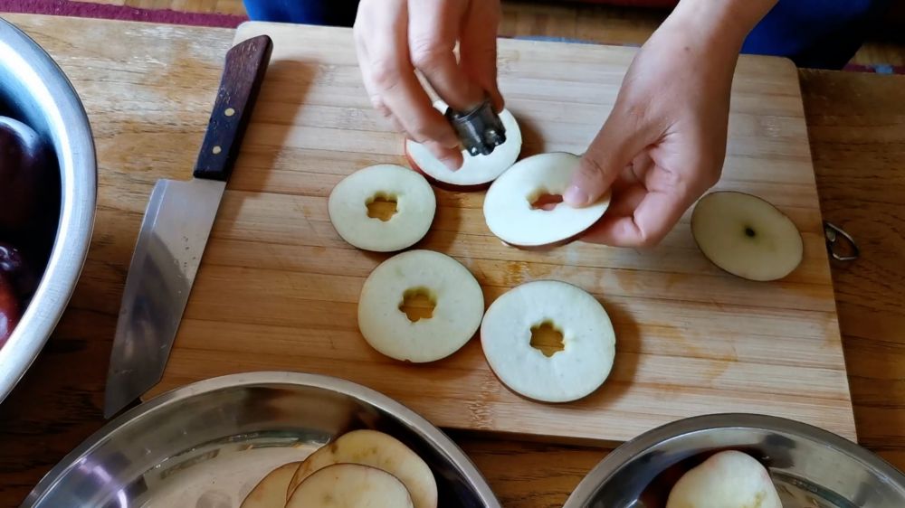 秋天大量的苹果上市了,价格也很便宜,可以做一些苹果干当零食,不仅方便保存,吃的时候也非常方便。切的薄一点干的快,厚一点干的慢,但是口感更好。苹果籽中含有氰苷,当它遇酸或者生物酶水解之后,会产生氢氰酸,有一定毒性,所以自己做苹果干,要把苹果核清理干净。传说:一天一个苹果,医生远离我。很多国家的老百姓都有吃苹果保健的草根理念,苹果也被科学家称为全方位的健康水果。餐前吃一点苹果干,会有饱腹感,有利于减肥。