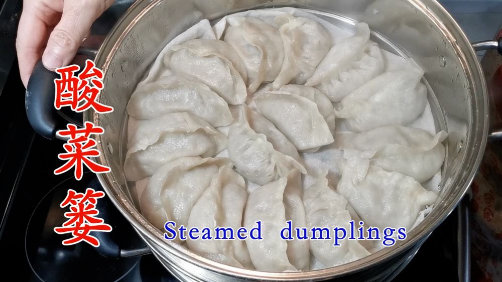 酸菜馅大蒸饺,包的时候放很多馅料,就像往背篓里使劲塞东西 ,所以东北人叫酸菜篓。 做法:400克面粉 270克开水(大约90度) 醒面大约半小时 葱碎 姜碎 油渣(油梭子)碎 放生抽搅拌 加花椒水和5克盐 一勺橄榄油 搅拌均匀 酸菜冲洗剁碎 挤出酸菜水 放入馅料中 加入虾皮和麻油 搅拌均匀就可以包了 包好的饺子放在干的屉布上 大火蒸十分钟 串两分钟再掀盖子 蒜泥放生抽和麻油就可以了。