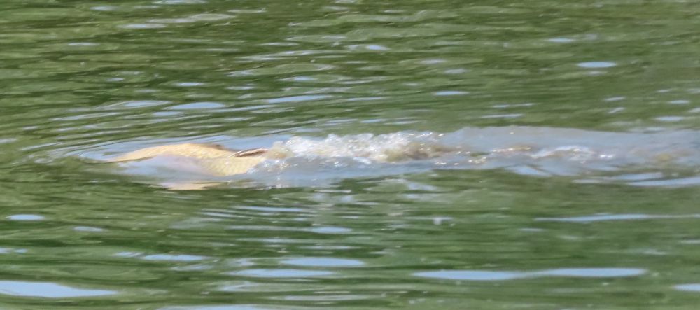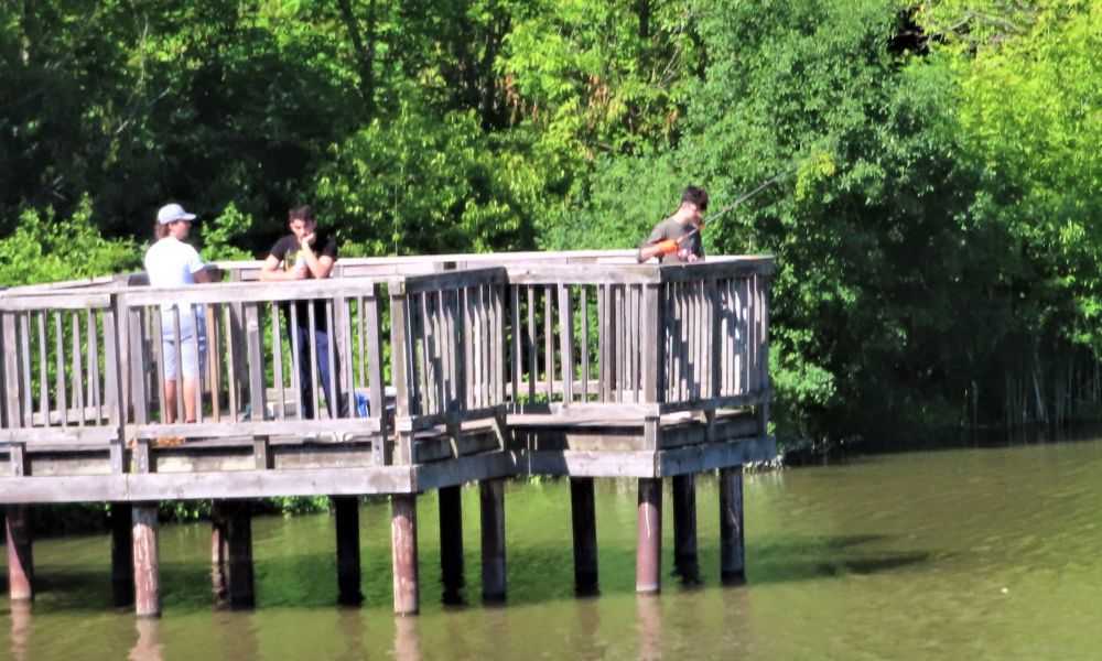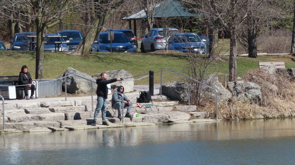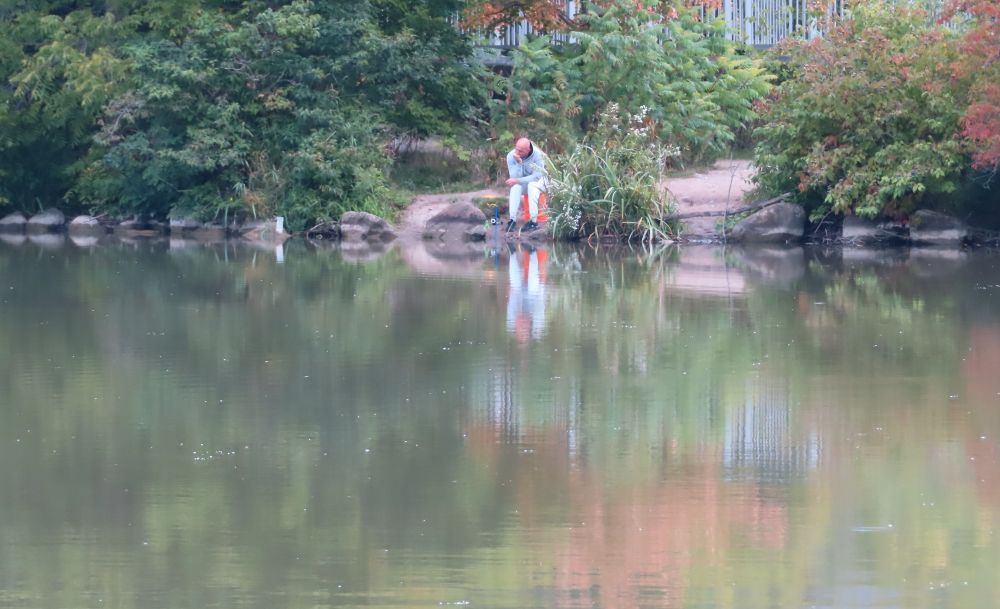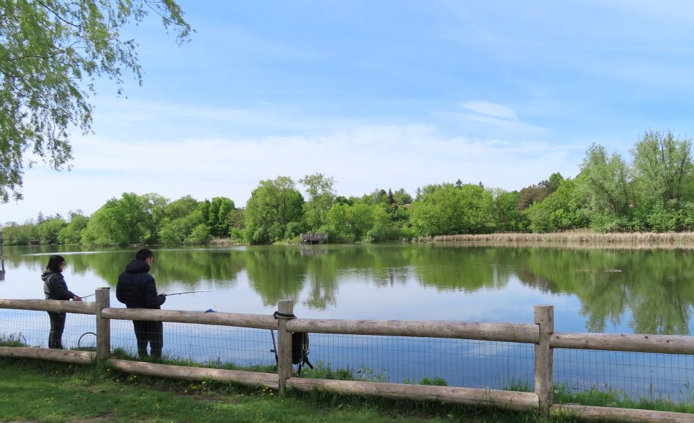 我几乎每天都要围特酷浜(Toogood Pond)转一圈,只要不结冰,总能看到有人在钓鱼。这个小湖里肯定有鱼,每年六月初,到了鱼汛期,许多大鱼在这里追逐嬉戏,湖面被搅得水花四溅。(图2)平时白鹭、蓝鹭和鸬鹚在这里觅食,一般都有收获。但我从来没有亲眼见到有人钓到了大鱼,只在特酷浜上游的溪流边,看到有人钓到过很多小鱼。(图9)