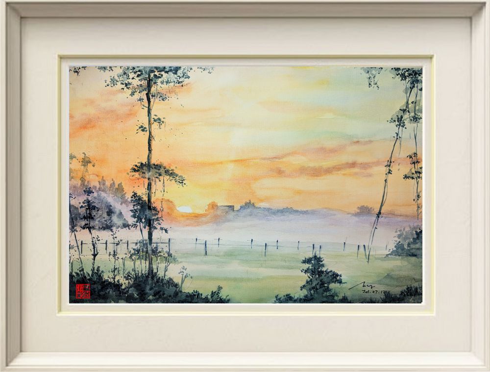 太阳缓缓升起,橙黄的光芒洒落草尖,点亮了每一片绿意。空气中仿佛弥漫着淡淡的水彩香,那是画笔与自然交融的气息,带着悄然的欢喜。远山在雾中隐约浮现,恍若沉睡的老人,默默守护着这片安宁天地。画面里每一笔都含情,每一色都似诗,缓缓吟诵着晨光下的温柔世界。