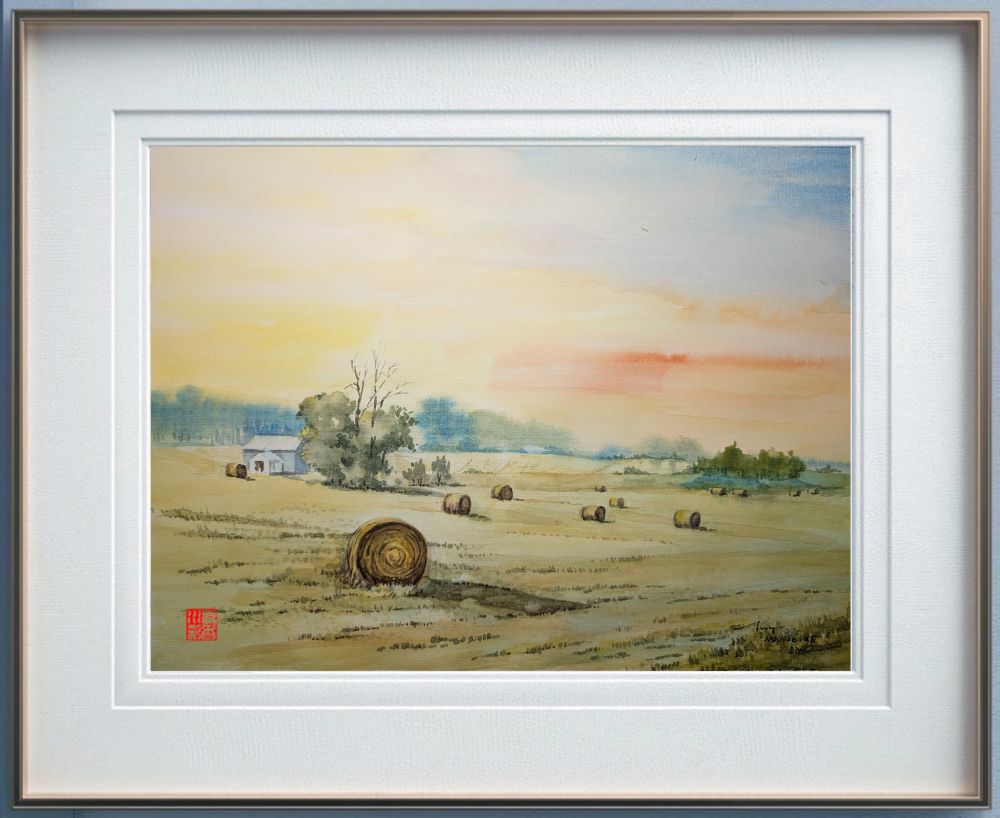 在金色晨光里,原野缓缓从夜色中苏醒。空气里带着刚割完的青草清甜,田间的卷草垛静静伫立,像被晨曦点亮的音符,散落在清朗的大地上。