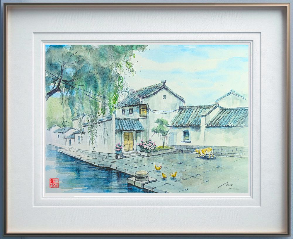 柳树,在水色里,一点点长出来。用深浅不一的绿,在纸上慢慢晕开。柳条低垂,若有若无地抚摸着那几面墙。墙面留白——岁月的旧色,都停在那里,把那光给一一留住。