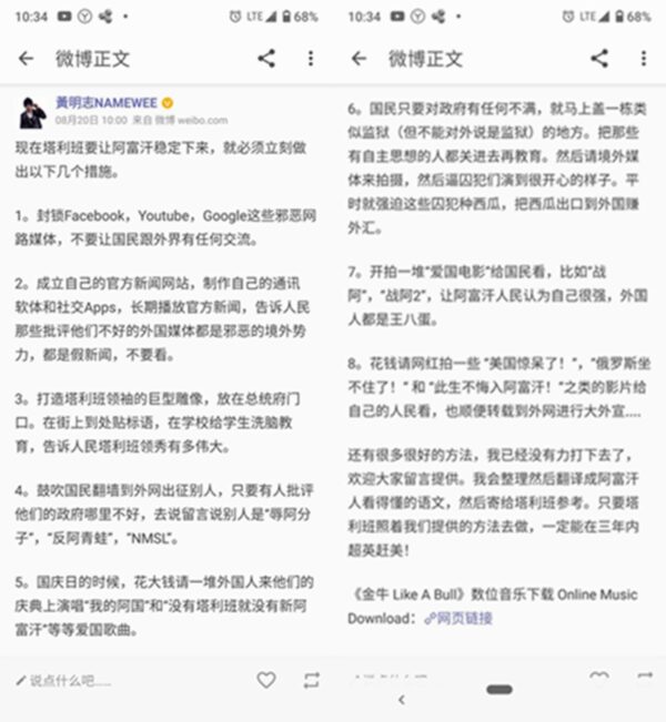 NTDTV报道,马来西亚知名歌手黄明志日前在微博发帖,对占领阿富汗的恐怖组织塔利班提出“8条建议”,疑似惹恼中国当局,黄明志的微博被封。8月20日10点...[阅读全文]