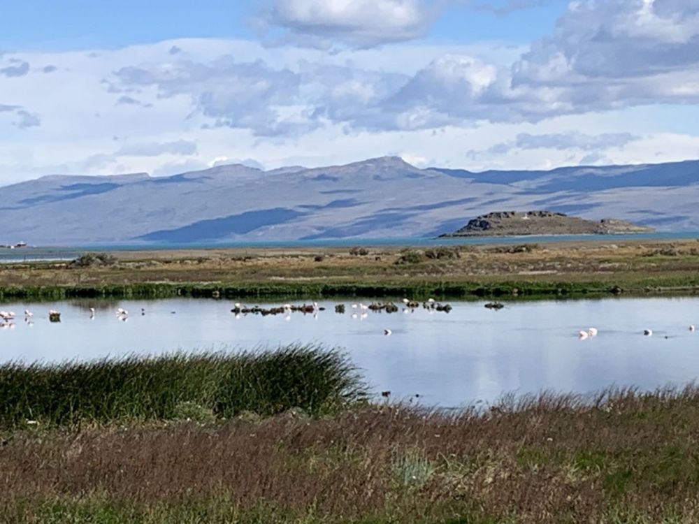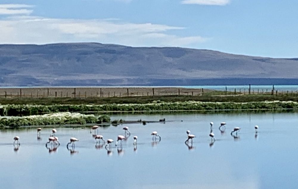 El Calafate就是一个湖边城市,城市边上的湖面有一大片湿地,花开鸟飞,自然景色非常美丽。Laguna Nimez是一个鸟类保护区的公园,一道简单的小门,分隔出公园和湖区,你可以看到数以百计的各种候鸟。一般有80多种,有的是当地的,也有的是从别的地方飞来的。可以观赏野生的flamingos(火烈鸟)在水面上走来飞去。公园内的徒步路线大约5至6公里,湖面上除了鸟,还有多种鸭子游来游去。湖的水质不是一般的纯净,有时在太阳下完全呈现碧绿色。阿根廷湖里有不同种类的鱼,真希望有更多的时间在湖边的阳光下垂钓。