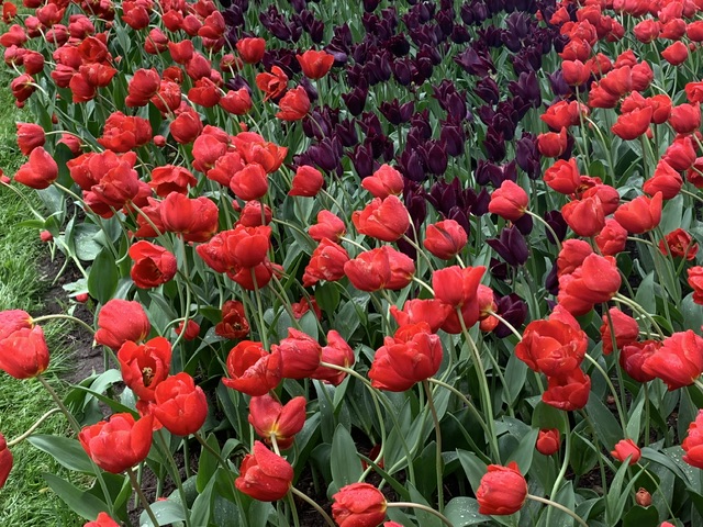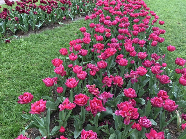 一到达花卉公园,我就被花海所震撼。成千上万的郁金香在绿草如茵的草坪上绽放,形成了各种华丽的色彩和图案。从鲜艳的红色、粉色到柔和的黄色和紫色,甚至从未见过的绿色,有的单层,有的多层,有的花边是光滑的,有的花边是锯齿状的,每一朵郁金香都展示出独特而美丽的个性。我仿佛置身于一个梦幻般的花园,每一步都给我带来新的惊喜。
