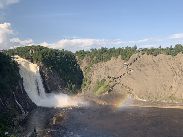 蒙莫朗西瀑布周围有多个观景平台,游客可以欣赏到壮丽的瀑布景色,同时也可以选择步行或乘坐缆车前往瀑布顶部,欣赏全景。