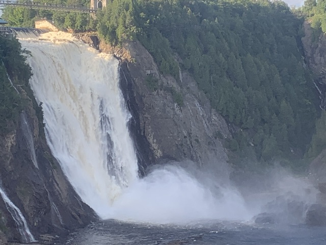 蒙莫朗西瀑布(Montmorency Falls)是位于加拿大魁北克省魁北克市附近的一处壮丽自然景观。它是魁北克省最高的瀑布,高度比尼亚加拉瀑布还要高约30米,总高度达到83米。这个瀑布位于蒙莫朗西公园内,距离魁北克市中心约15公里,是一个备受游客欢迎的旅游目的地。