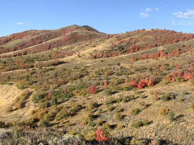 山坡上的色彩过渡:在Emigration Canyon,你可以看到从山脚到山顶的色彩过渡。下面是绿色的树林,中间是红色和金黄色的树叶,最终到达山巅,这里的树木呈现出橙色和棕色。
