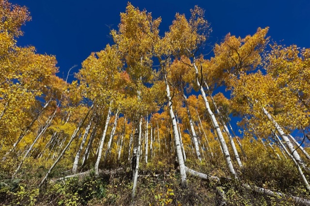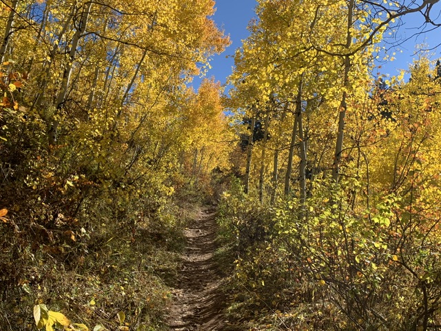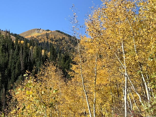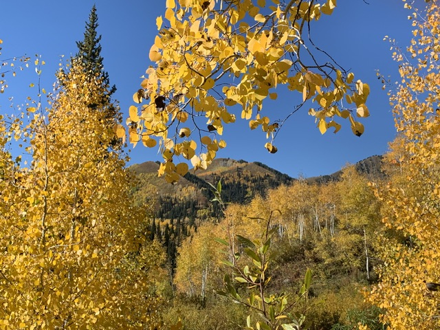 秋天是Mill Creek Canyon最美的季节之一。当我踏上这个迷人的徒步胜地时,被眼前的景色所震撼。树木在金黄的包围下显得格外壮观。特别是杨树(Aspen), 这些树的叶子有薄而柔软的叶片,它们在微风中颤动,发出轻柔的声音,因此得名“颤树”。这种特点使得Aspen在风中显得格外引人注目。