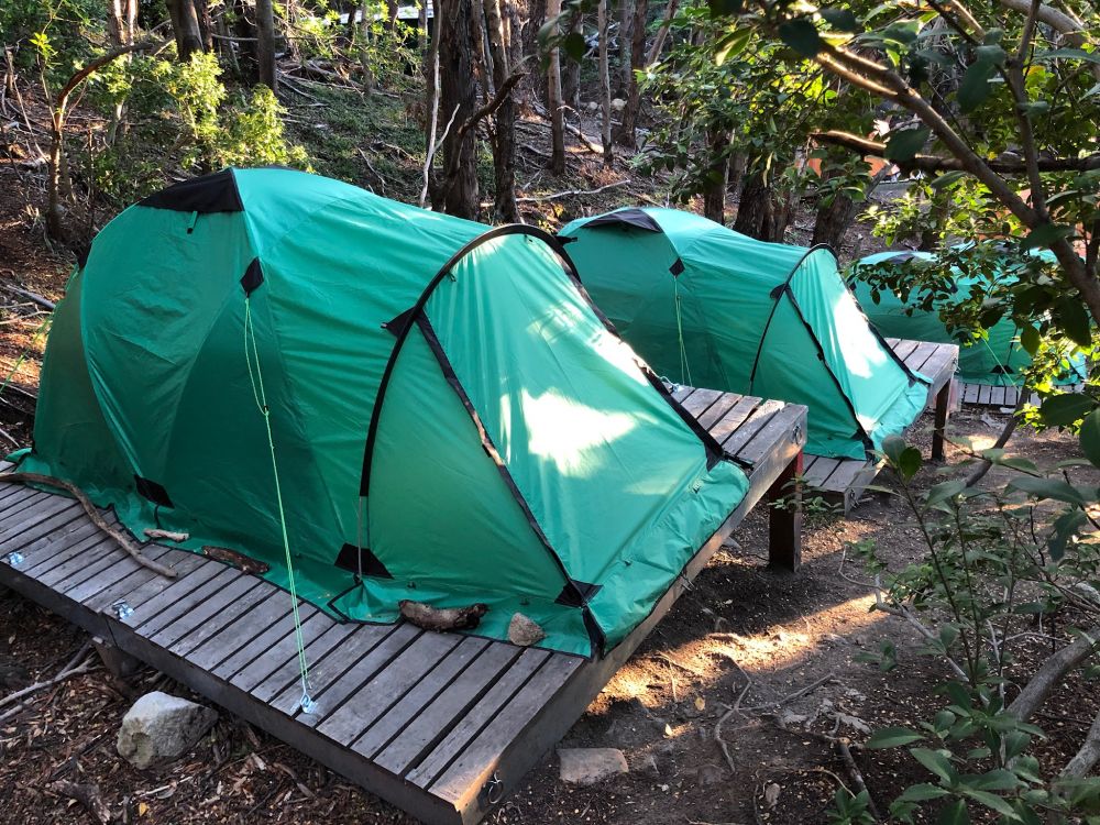 树林里为客人搭好了帐篷,备有睡袋。