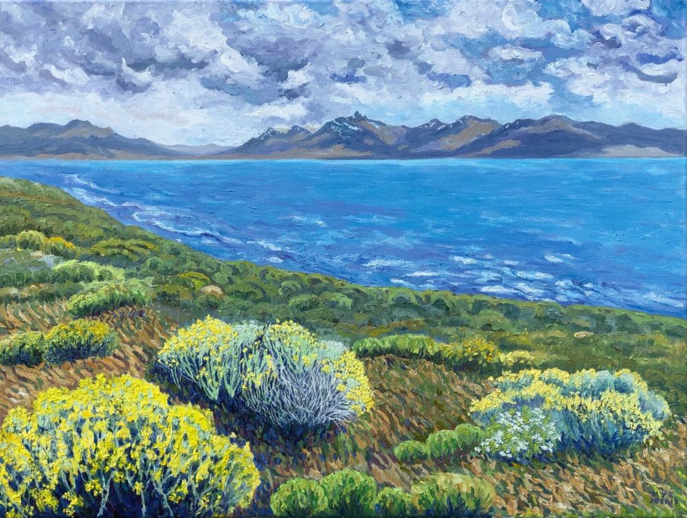 虽然离开美丽的阿根廷湖几年了,碧玉般的湖水,沿岸的群山,河岸上的一簇簇黄花,一直在脑际莹绕。今天终于把这段记忆留在画布上。