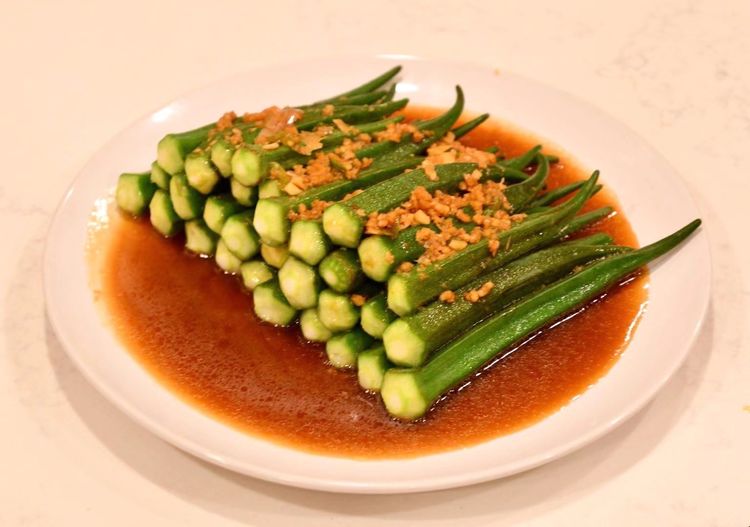 今吃点素的:蒜蓉秋葵,玉米拌火腿粒