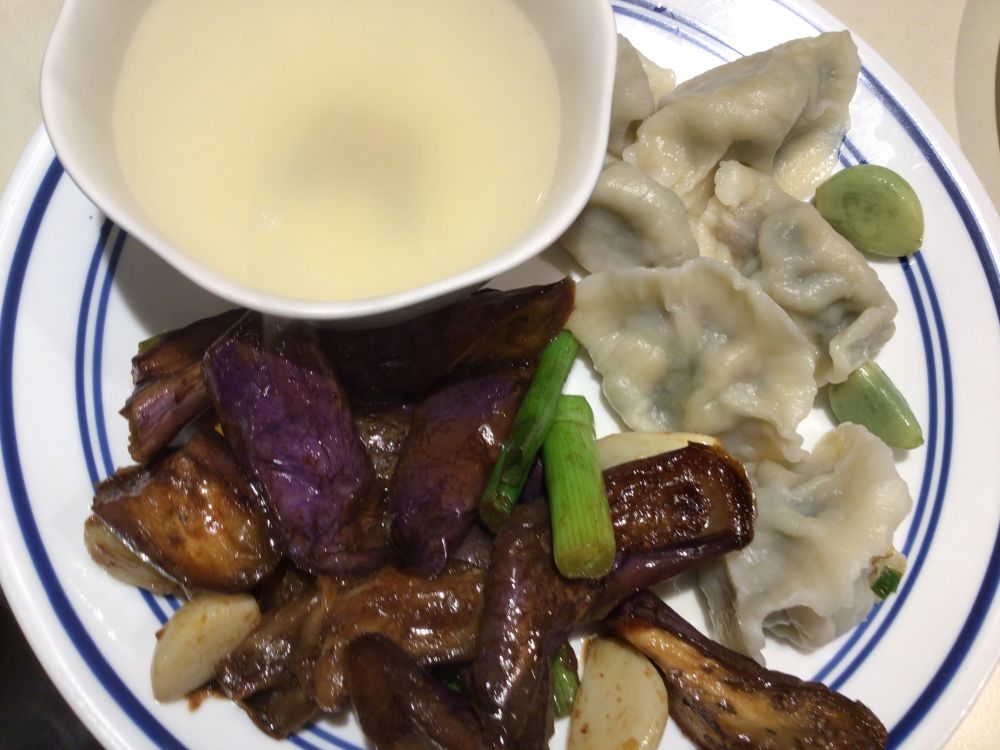 腊八蒜汁油焖茄子+院长韭菜包饺子。