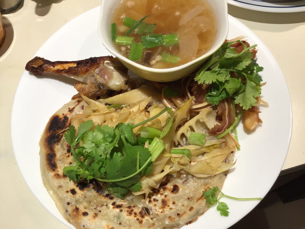 晚餐:烤鸭腿+猪耳丝+腌笃鲜+饼包新鲜笋片