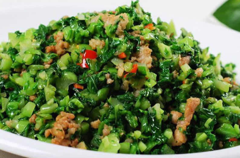 院里摘的新鲜雪里蕻,加红辣椒碎,炒肉丝,吃白饭。