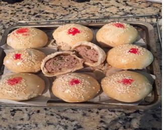 油酥材料:中筋面粉140克,玉米油70,糖5g(可以不放)。餡,猪肉米400克。做法:1,油皮面,糖和面粉拌匀加水揉成面团,加入油继续揉成光滑面团醒2个小时。2,油酥,糖和面粉拌匀加入油揉成光滑面团醒发,时间不要很长隨意。将油皮面和油酥各分成18份,将油酥包在油皮面里,撖成长舌形由外向内卷好两头对折,醒10分钟。面醒好后撖成园形,将20g肉餡包在里面摺子向下,全部做完刷蛋液(蛋黄部分),洒上芝麻。烤箱380上下火20分钟。