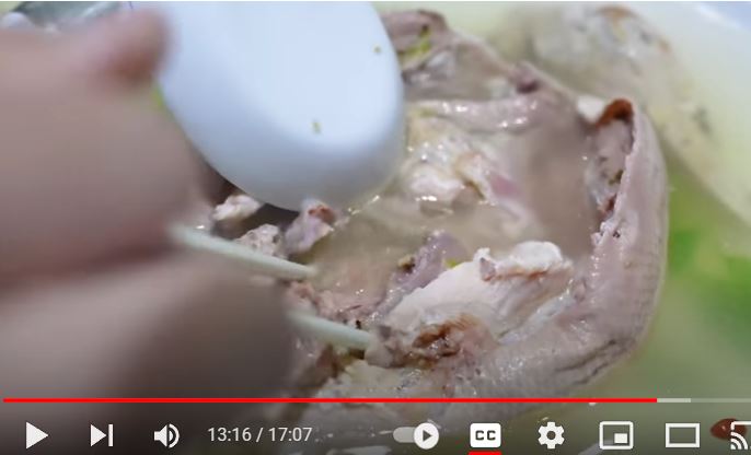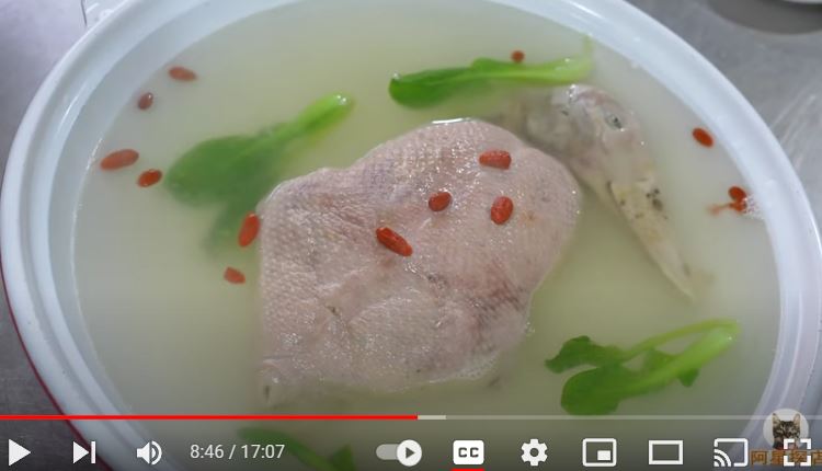 都处理好了,用力把小鸡塞进猪肚里面,再把蒸煮后的鲜鳖坐在有鸡在里面的猪肚上面,放在鸡汤里小火慢功再炖一整天,不时添加鸡汤和枸杞等中药而完成。