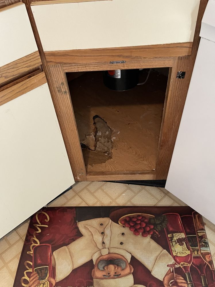 第一张照,昨清晨3点am,厨sink下水管爆破,水流四处,租客把厨柜下的门拔下来,弄破了两处,try to stop water,事后,得买新门装,很头痛找此老style的门,来代替。警急修漏水管950元,任人宰割,因为是临晨3点,但租客弄破了门损失,该算谁赔?