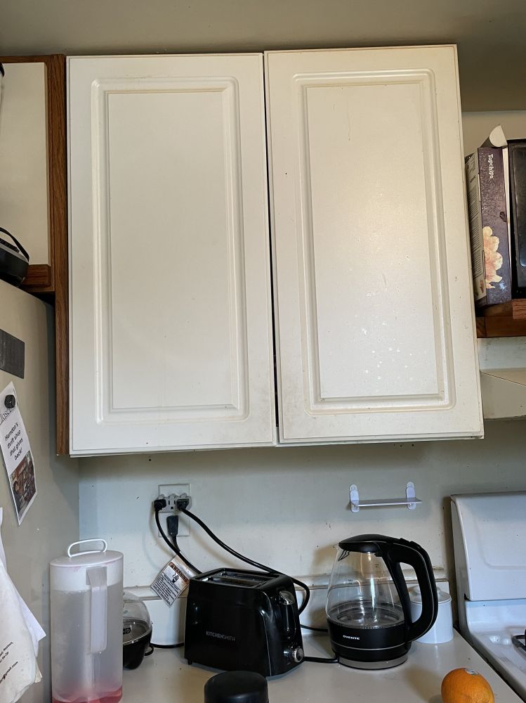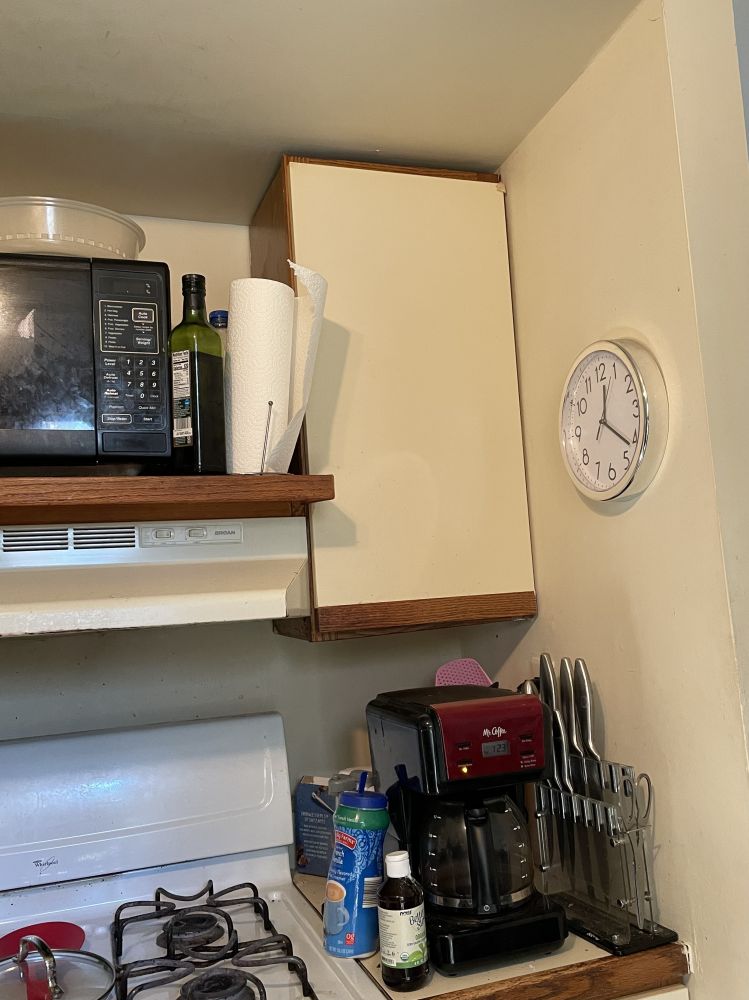 第三张照片是原本厨柜设计的样子,第二张是3年前,租客刚搬来,放太多重罐头,把厨柜弄垮下来破了,我买不到这老style的柜,就换了这类似的新特白色厨柜。