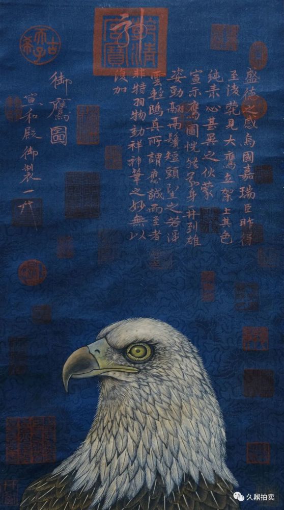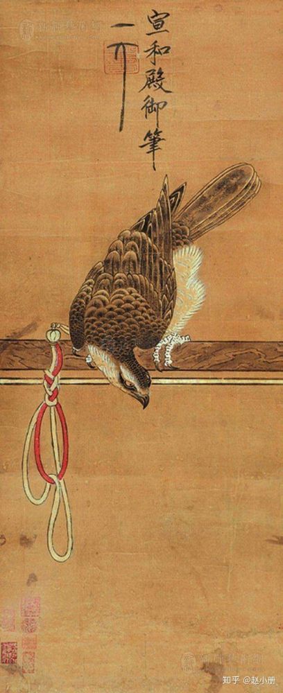 宋鹰画的左上角,有“宣和殿御制一人”的宋徽宗亲笔签名。在最高中间一字“神”是乾隆破坏很多国宝画的证据,里面的印章90%也都是他的。