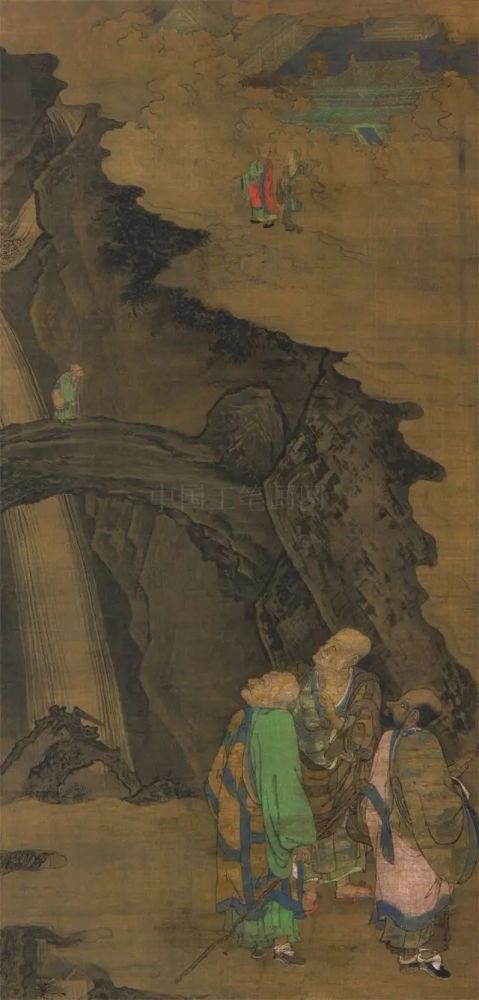 石桥是画中山水之眼,众多罗汉围绕石桥展开。石桥在画的中部,看上去高悬于山崖,不远处飞瀑直下,显石桥之险。桥上有一罗汉躬行,近处众罗汉仰头侧目望之,感觉他们都在眺望桥上的罗汉,好像在惊叹石桥与悬瀑的险景,好像在眺望远处天上飘然而来的“神仙”。画面犹如现实与神话的结合,富有故事性。