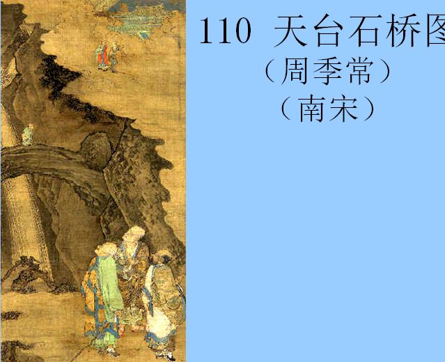 《五百罗汉图》,原是周季常、林庭珪应明州惠安院僧人羲昭之约历时十余年为该院绘制的佛画珍品。此画画高超,画笔细腻,既有工笔之美也有写意之神态。天台石桥图是其中一幅最有创意的人神交流画,说的是一老罗汉曇猷 (死於公元 396) 告别图右下3活着的罗汉友人,独自走上浙江天台石桥,通往天堂仙庙体验死后的生活数日,(图右上角2罗汉是已死升天的仙人)然后又回到人间活了10年,最后再往生到生前已去过的仙庙永远住下。