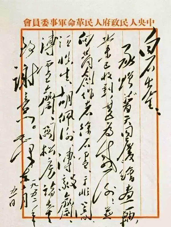 释文:白石先生:承赠‘普天同庆’绘画一轴,业已收到,甚为感谢!并向共同创作者徐石雪、于非闇、汪慎生、胡佩衡、溥毅斋、溥雪斋、关松房诸先生致谢意。毛泽东一九五二年十月五日。