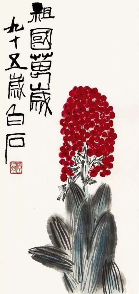 1955年国庆时,95岁高龄的白石老人以真挚的感情创作了又一件《祖国万岁》。画面以一棵果实累累的万年青,象征祖国强盛,人民生活幸福万万年长。万年青的叶片由粗细、长短不等的竖线构成,并不做复杂的穿插变化,可谓简而又简。色彩上,红果实在蓝绿叶片的衬托下显得格外红火,艳而不俗,强化了果实累累的厚重感,营造出喜庆欢欣的意象。“祖国万岁”四个篆书大字,笔画亦取方折之态,与万年青纵向的形象相互映衬,强烈地表达了老人的爱国之心。