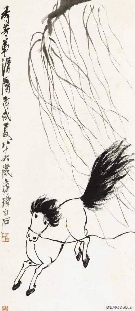 最有意思的是什么?在马的后上方齐白石双画了一棵柳树,这就与刚才所讲的马尾头毛相互应和了。