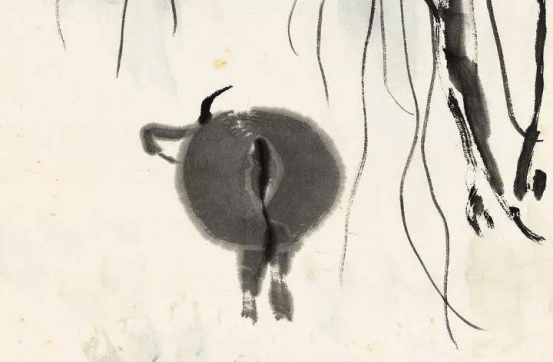 正是因为这一种精妙的构造,让牛单纯从背影就能看出很有活力,它在张望四周景象,而并非是较为死板的作画,加上这幅画的用笔数量并不多,留给观众很大的想象空间,可谓是意韵深远。因为从这个细节处很容易引发人的想象,为何这头水牛并没有正常行走,它的侧头是为了何物呢?当人们心中产生这些疑问之时,恰恰就是该幅画点燃共鸣的时刻,这便是大师功底的流露。(资料部份来自网路)(ZT)