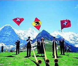 晚饭在瑞士的法德混合式餐馆吃,火腿,烤鱼,马铃薯汤配清蒸小芥蓝菜,都很可口。饭后就在前面舞台上即兴表演了瑞士民间音乐,比较有特色的是阿尔卑斯山民的音乐。在声乐方面有称为“约德尔”的山歌,较原始的没有歌词,只有若干音节,反复用从真声到假 声又回到真声的唱法,尤呼呼,尤呼呼,尤呼呼呼!还有山民和牧民们常用阿尔卑斯号,一个很细长的喇叭(木制,长约90~300厘米不等)招呼畜群归来,其传统音调有50种以上,形成特别的牧民歌曲。